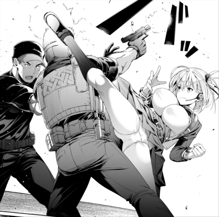 敵に近づく千束ちゃん。敵がそのおっぱいにガン見している
